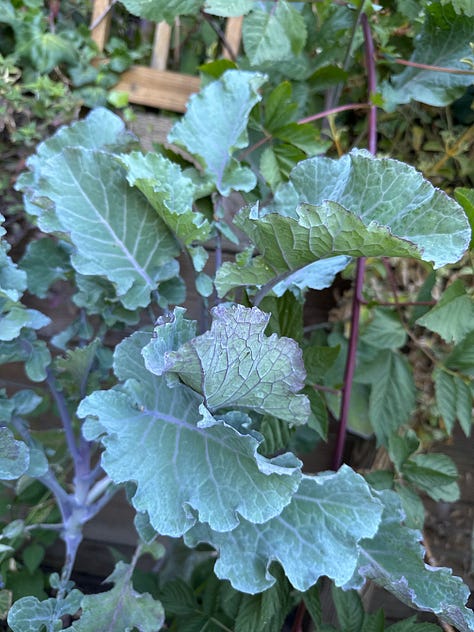 The kale, still vibrant in summer heat, has taken on a new role. One long leaf in particular has become a favorite among the younger children, dubbed the “kale popsicle.” They munch on it joyfully as they explore in the garden.