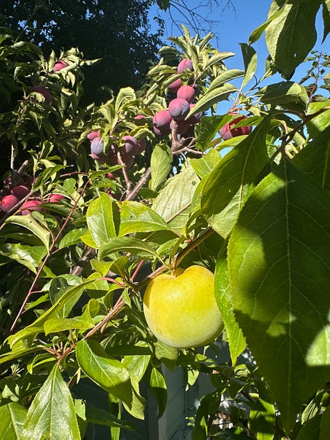 We noticed one of the fruit trees had begun to drop its plums, not the usual Santa Rosas we have seen lately, but a yellow-fleshed variety, tart and firm. A quiet mystery. They were gathered eagerly, tasted thoughtfully, and shared among friends.